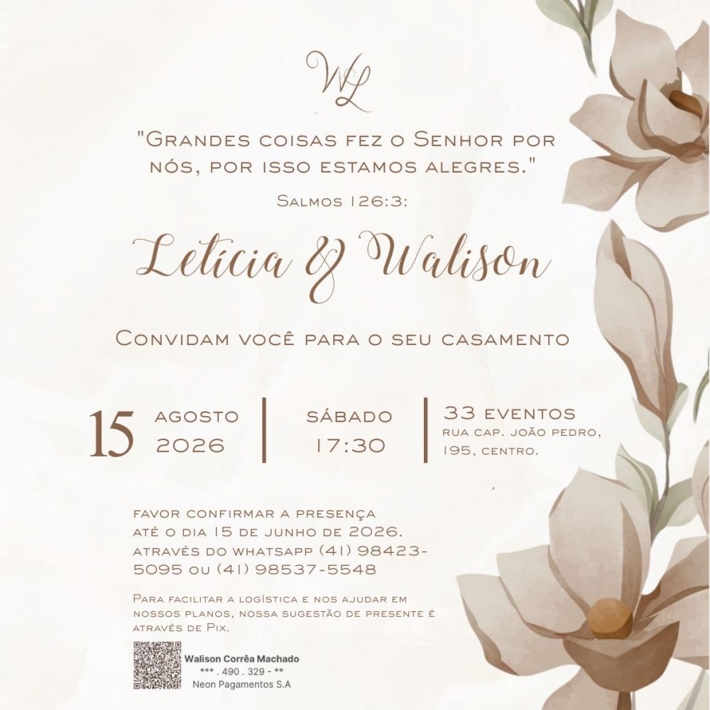 Preparamos este site para compartilhar detalhes sobre o nosso grande dia com as pessoas mais especiais que conhecemos. Se você recebeu o link que te trouxe até aqui, saiba que você é uma delas e que o escolhemos a dedo com muito carinho e muita gratidão por fazer parte da nossa história. Estamos muito felizes e queremos comemorar esse sonho com vocês, por isso, ter vocês conosco será um privilégio. Então não deixe de confirmar sua presença, separar seu traje e salvar a data do nosso casamento na sua agenda.